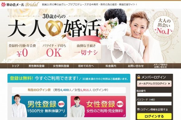 華の会メールBridalは30歳以上を対象としたコミュニティサイトで、落ち着いた大人の出会いを提供してくれます。