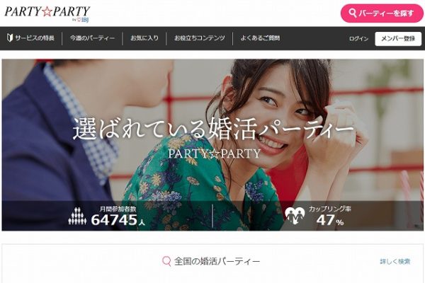 パーティーパーティーは、月間参加者数約66,000人、カップリング率47%の実績を誇る婚活パーティー。